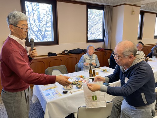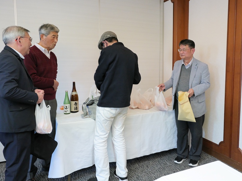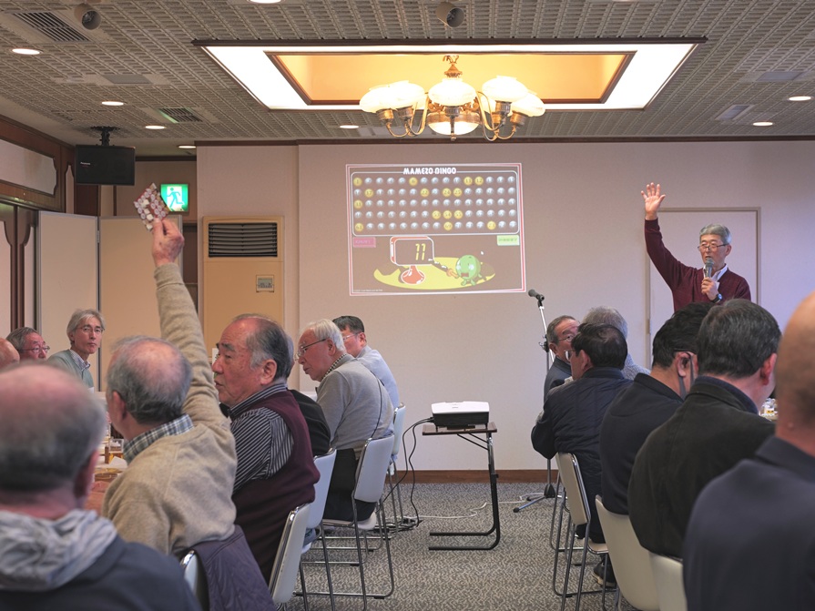 会の中盤、恒例のビンゴゲームでは、希望する数字が飛び交い、その数字が本当に出てビンゴするなど盛り上がりました。 終盤、金婚を迎えられた菊池紳一さん、西野直喜さん、古希を迎えられた深見泰正さん、吉田正弘さんに記念のお守りを手交しました。