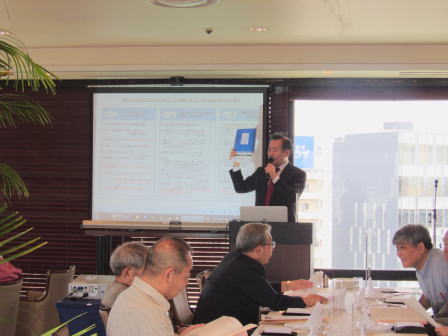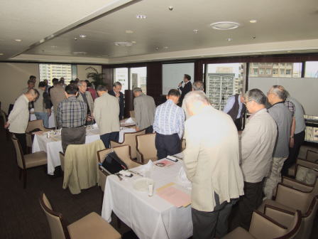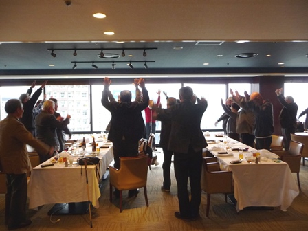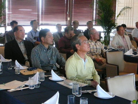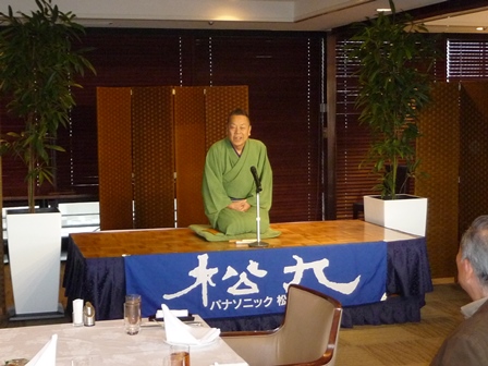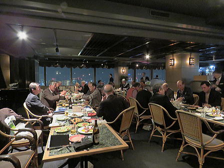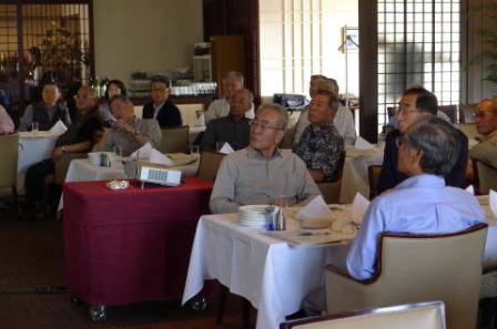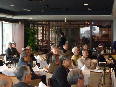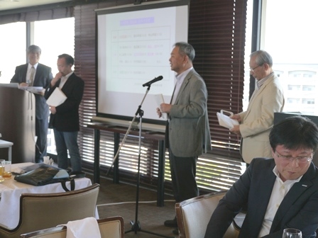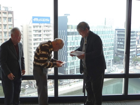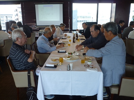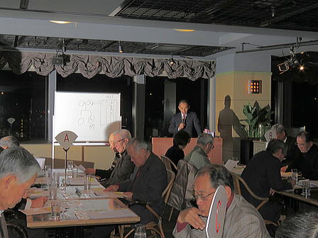脳の病気である脳卒中(脳梗塞・脳出血・くも膜下出血)に関連した内容について実例を交えながらの解り易い解説有。 脳に異常を感じたら即 病院へ行く方が直る確率は高いそうです。脳卒中の原因となる高血圧・高脂血症・糖尿病・不整脈解等の持病をお持ちの方は一度「脳ドッグ」を受けた方が良いとの事でした。最新の技術では3D映像等30分程度の診察で済み、診療機器が遊んでいる休日の時間帯がお薦めとのことでした。 セミナー終了後忘年会へ移行、清成幹事から会員の近況報告等に続き、12月17日に金婚を迎えられます志田野さんへの松九会からのお祝い品の贈答が行なわれました。 志田野さんの乾杯の音頭で始まり、新規会員の自己紹介等挟みながら、お互いの近況報告や情報交換等に加え眼下の中州の夜景も楽しみ乍
