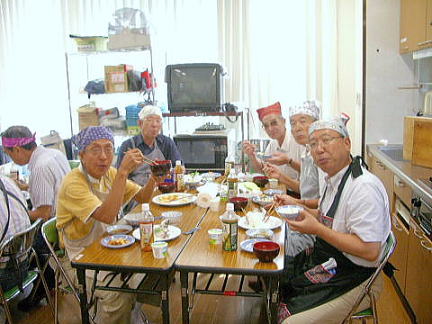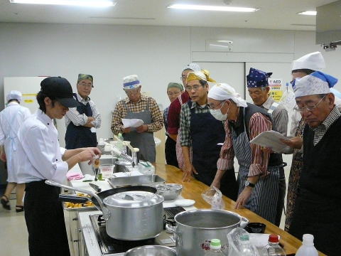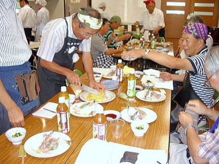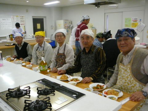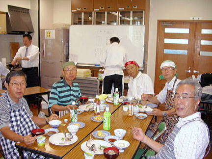 | 9月24日福岡/西地区として初の料理教室を唐人町の『当仁公民館』で開催しました。日頃 料理を殆どしない参加者15名は、魚国さん6名の料理指導のもとでアジのお造りや卵料理など合計5品目の調理に挑戦しました。 ユーモアを交えた料理長のご指導とスタッフのご支援を受け取り組みましたが、口八丁手八丁とはいかず、“船頭の多いこと多いこと”おかげで予定時間を30分もオーバーする事になってしまいました。特に「アジのお造り」は「アジのつみれ」に近いものもあり、卵料理の仕上がりは料理長も打つ手無しの形状に仕上がるなどでしたが、和気あいあいに進められました。 料理完成後は全員で昼食懇談、自身作(?)はとても美味しいとの結論になりました。 最後に借用した場所の後片付け・清掃を行い、魚国さんに心よりお礼を申し上げ、解散となりました。