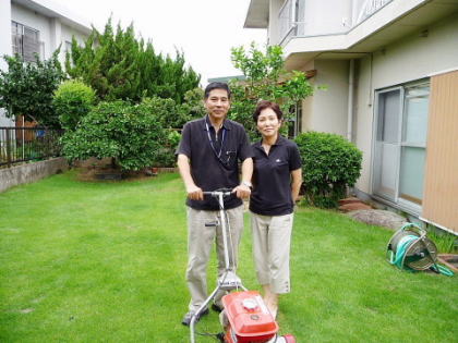 奥さんと一緒に自宅の芝刈り中 |