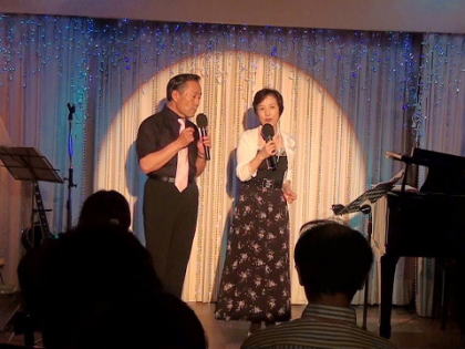約40名収容の会場でしたが満席の盛況でした。映画音楽・ミュージカルから17曲を選曲され、ソロやデュエットで約2時間弱の熱唱でした。歌詞を覚えるのに苦労されたとの事でしたが誰でも一度は聞いた事のある曲ばかりで非常に親しみ易い内容でした。他人の前で披露する勇気と夫婦同じ趣味を持っての余暇の楽しみ方等、退職後の生活のあり方として参考にしては如何でしょうか。今後は機会があれば老人ホームでの慰問等、ボランティア活動を目指したいとの事でした。(レポーター 石丸盈) |