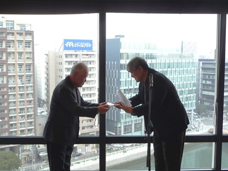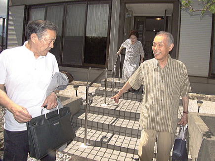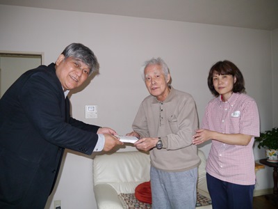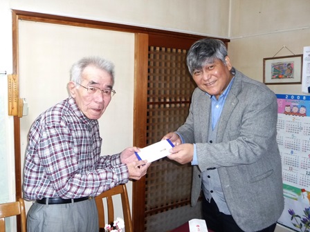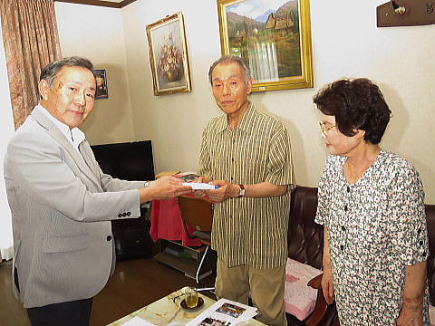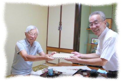 松九会から長寿者へのお祝い品を、今回より郵送から直接お届けすることになり(古希祝のみは今まで通り事務局より郵送)、第一回目が9/11に傘寿を迎えられました志田野治朗さん(城南区友丘にお住まい)ということで西地区幹事の清成さんに同行訪問しました。色々とお話しする中 日常生活のあり方等参考になる点や会社の昔話等で大いに盛上り、楽しい一時を過ごさせて頂きました。直接訪問という事でご意見・要望事項等をお聞き出来ること、松九会としても会員の皆様方の近況が解る等々お互いメリットは大きいと思います。又退職されても会社の動向を気にされて居られる方は多いと思います。担当される方の負担増や直接訪問されるのを嫌われる方も居られるかとは思いますが、可能な限りこのような取組を積極的に進めて行きたい。(レポーター 石丸盈) |