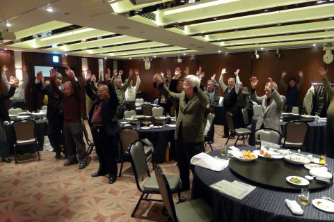 和やかな雰囲気での歓談後、岡山さん恒例の三三七拍子で締めとなりました。最後に最近入会された方々の行事参加のお願いと、清成幹事・立石、浜地地区委員お疲れ様でした。皆様良いお年を!(レポーター 石丸 盈) |
