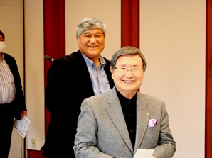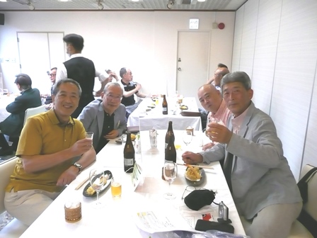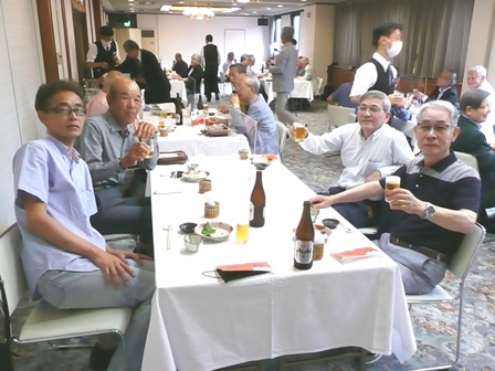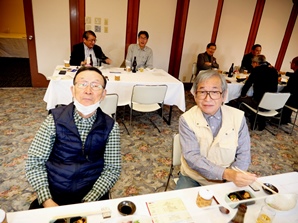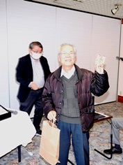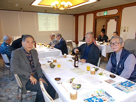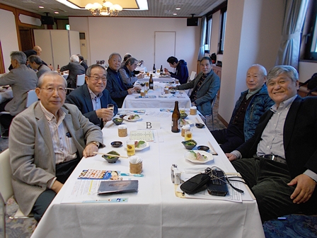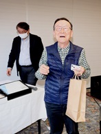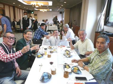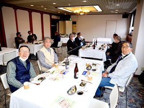 均さん(金婚)、筒井さん(傘寿)、梶山英明さん(傘寿)、谷さん(古希)へ干支のお守りを手交。代表して芳賀さんにご挨拶いただきました。2020年以降入会され行事初参加の吉永和憲さん、山口雅司さんからは自己紹介と近況報告をいただくなど、しばし時を忘れる中、谷さんの中締めの後、集合写真を撮影し解散しました。最終参加者15名に減少も皆様久し振りでの対面での開催を楽しまれていました。 (レポーター