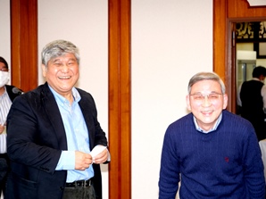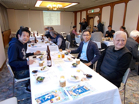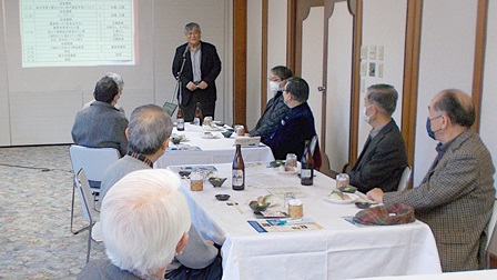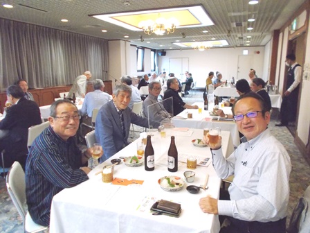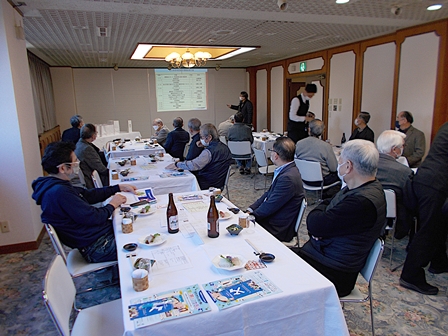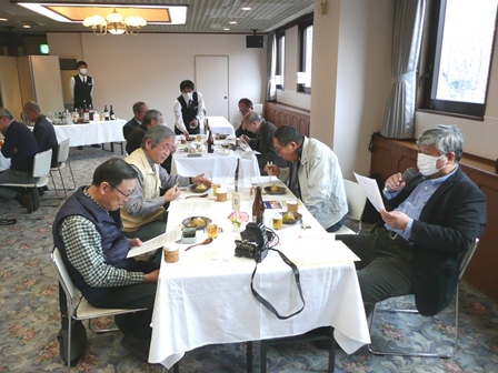 | 予定していた新年懇親会を新型コロナ対応で延期し3月20日に春季懇親会として、冷泉閣ホテル川端で開催。”まん延防止”も解除されましたが、ワクチン3回接種済などを参加条件に安全確保して開催しました。松尾地区委員の司会でスタート、水﨑幹事の挨拶・乾杯に続き、行事が殆ど開催されなかった2年間の松九会活動概況を報告。各テーブルでは、近況報告や昔話に花が咲き、筒井勝美さんより提供の特上ワインを皆で味わいつつ楽しいひとときを過ごしました。会食合間では恒例のビンゴゲームで盛り上がり、谷泰徳さんが特等の後、12人が景品獲得。その後、水﨑幹事より2022年慶事者で今回参加の芳賀