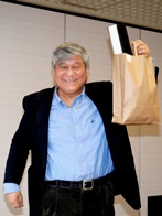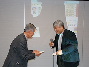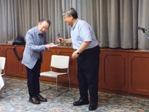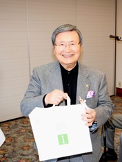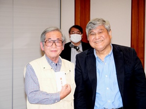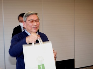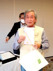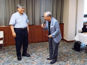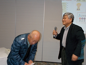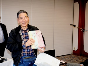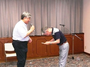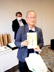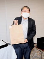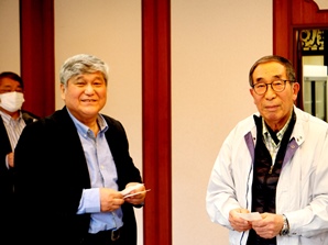 ![]() 水﨑幹事より傘寿の北原さんへ「御守」手交 |