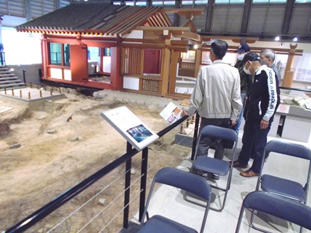 公園内の移動には、森地区委員が車いすを準備・サポートするなど優しい心配りで対応しました。展示館では、最初に記念撮影を行い、その後、古代の外交最前線施設