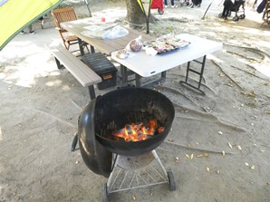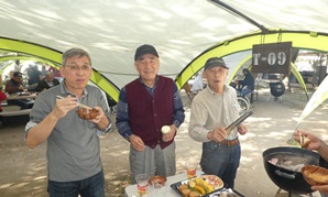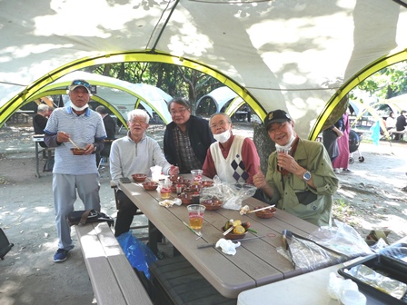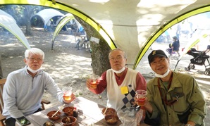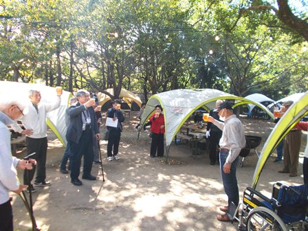 懇親会を開催しました。会場は屋外で、5~6名単位のテント構造のバーベキュー施設です。森地区委員の司会で開会、続いて水﨑幹事よりの挨拶、参加者最高齢の