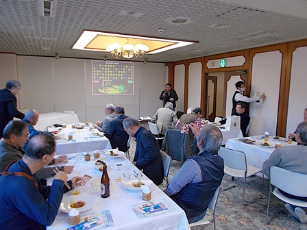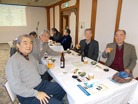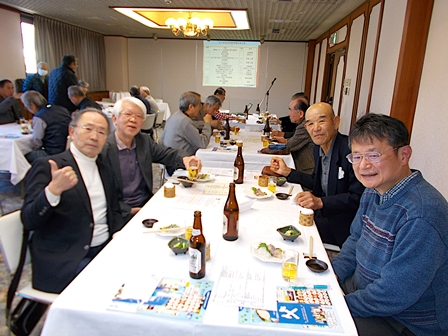 | 西地区新年懇親会を冬晴れの1月21日、福岡市博多区の「冷泉閣ホテル川端」において、23名の参加で開催しました。 今回主担当の松尾地区委員が司会進行、水﨑幹事の主催者挨拶の後、栗川さんの乾杯の音頭により懇親会は和やかにスタートしました。今回も、筒井(勝)さんから銘酒の差し入れがあり、酔うほどに会話も一段と弾みました。会食懇談と並行して各種の催しが行われ、先ず、松尾委員による「株式売買で損失が出た時の確定申告について」のプレゼンがあり、自身の経験を踏まえて要点が解説されました。次に、童心に帰って、全員参加のビンゴゲーム。10個の景品をめぐって真剣にカードとにらめっこでした。その後は、恒例の慶事者への「御守」手交。今回出席者で、金婚の浜地さん、傘寿の小川(清)さんに水﨑幹事より手交後、それぞれに挨拶を頂きました。 終盤は、今回初参加の小島さんを紹介、挨拶を頂き、その後、2月25日(土)開催のカキ小屋パーティー告知。中締めは中村(剛)さんと、あっという間の盛り上がった2時間でした。最後に全員で記念撮影をして散会しました。 (レポーター 岡部幸雄) |